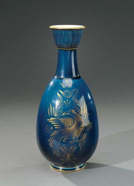 Vase ovoïde à haut col en porcelaine émaillée bleu saphir à décor d'un oiseau branché doré. Signé du cachet de la Manufacture avec la lettre date I et A. Kieffer. H: 33 cm
