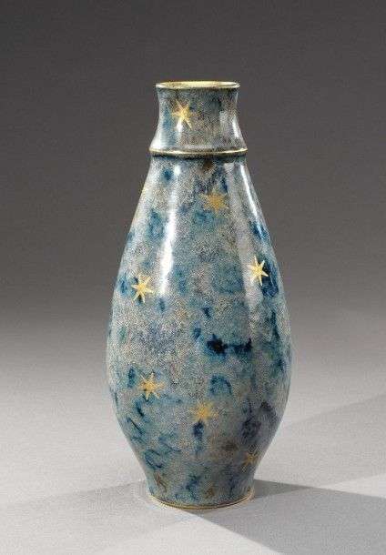 Vase ovoïde en porcelaine émaillée à décor de flocons de neiges dorés sur fond bleu nuancé mauve. Signé du cachet de la Manufacture avec la lettre date DN pour 1912. H: 25,5 cm