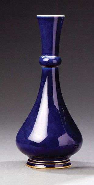 Vase balustre en porcelaine émaillée bleu rehaussé de filets d'or. Cachet de la manufacture et daté 94-95. H: 32,5 cm (*)