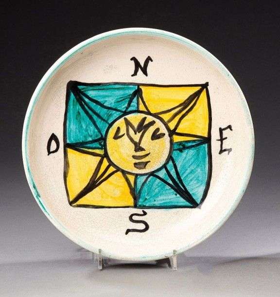 Plat circulaire en céramique émaillée polychrome figurant les points cardinaux. Signé "Jouve" et monogrammé. Vers 1950. Diam: 28,5 cm (restaurations)