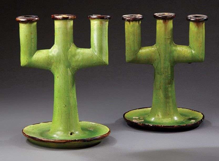 Paire de candélabres à trois bras en céramique émaillée verte et brune. Signés du cachet en creux. Vers 1960. H: 28 cm (éclats et fêles internes)