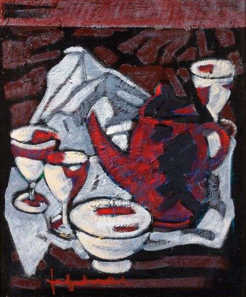 Le petit déjeuner Acrylique sur toile, signée en bas à gauche, contresignée et titrée au dos 55 x 46 cm