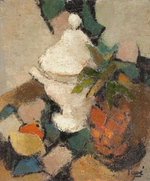Nature morte à la soupière et ananas Huile sur toile, signée en bas à droite 55 x 46 cm