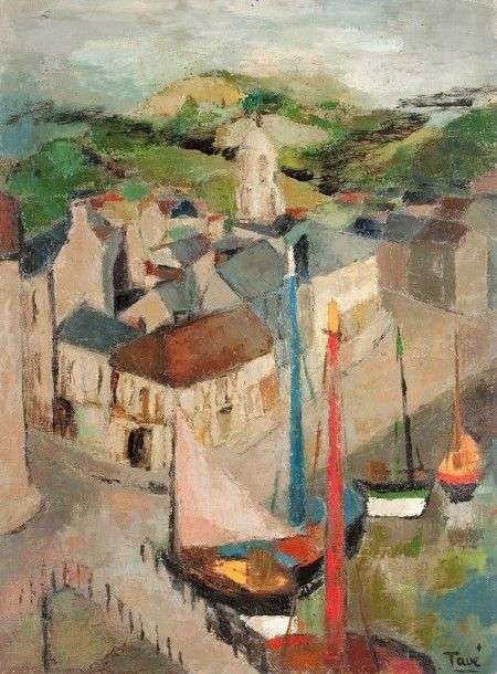 Vue de port au mât rouge Huile sur toile, signée en bas à droite 81 x 60 cm