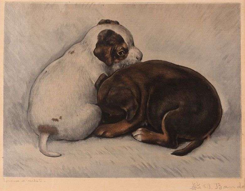 Les chiots Estampe sur soie Epreuve d'artiste signée 24x33 cm