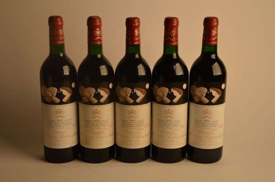 5 B CHÂTEAU MOUTON ROTHSCHILD (4 B.G| 4 e.t. légères + 1 accroc| 1 capsule légèrement gonflée) GCC1 Pauillac 1986