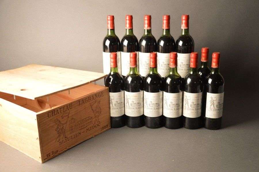 12 B CHÂTEAU LAGRANGE (Caisse Bois) 2 T.L.B| 2 H.E.+| 5 H.E| 2 M.E.+| 1 M.E| 1 e.l.s| 5 c.c GCC3 St Julien 1983
