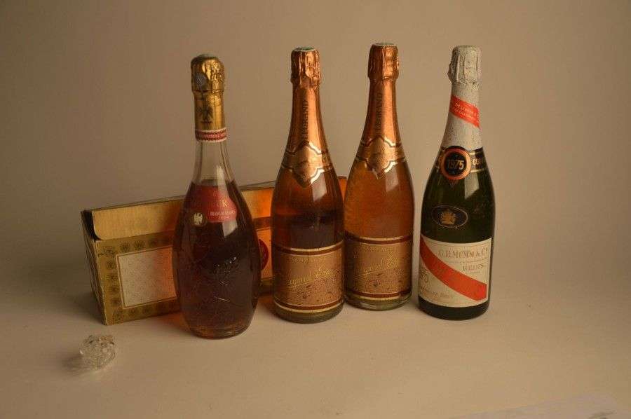 1 B CHAMPAGNE RESERVE DE L'EMPEREUR Blanc de Blancs (étui) L.B| coiffe corrodée| aspect trouble Mercier 1964 1 B CHAMPAGNE CORDON ROUGE (e.t. légère) Mumm 1975 2 B CHAMPAGNE BRUT Rosé Legrand NM
