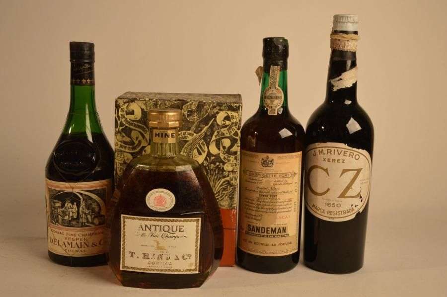 1 B COGNAC VESPER VSOP (L.B| e.l.s.) Delamain NM 1 B COGNAC VIEILLE FINE CHAMPAGNE ANTIQUE (étui) L.B| e.l.a. Hine & C° NM 1 B PORTO Sandeman NM 1 B XEREZ CZ MARCA REGISTRADA (e.a.) J.M. Rivero NM
