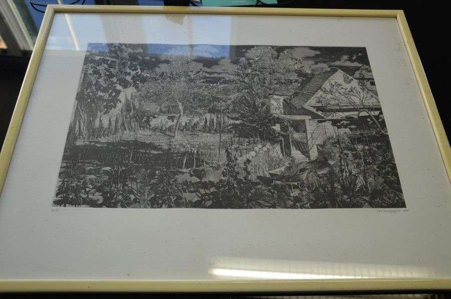 [GRAVURES] - DESMAZIERES Erik. Maison et jardin à la végétation luxuriante. Eau-forte originale signée en bas à droite, datée 1988.
