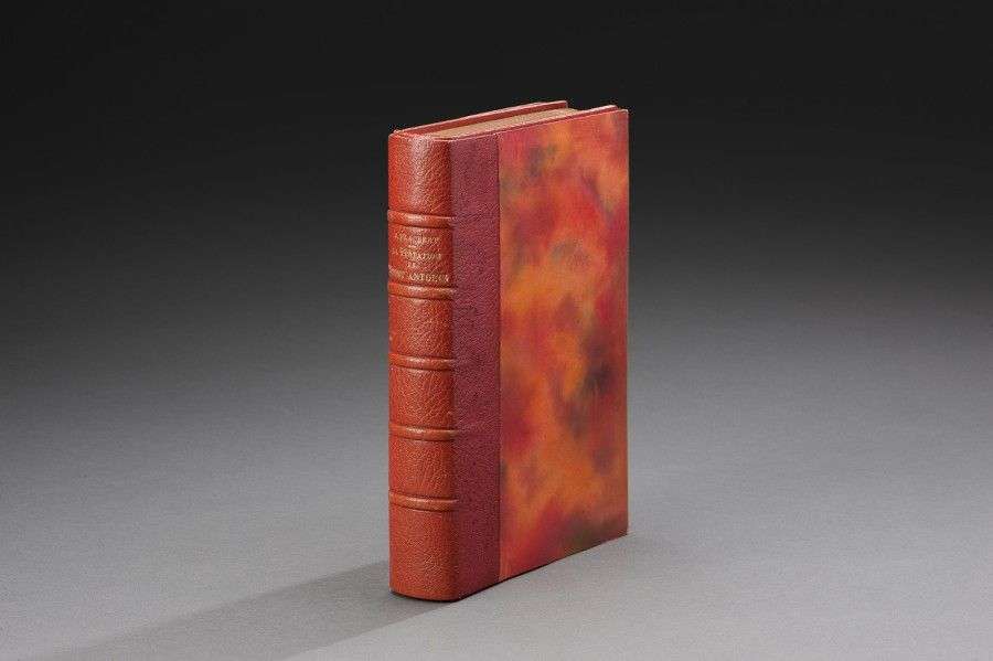 Paris, Charpentier, 1874| in-8, plein maroquin framboise, encadrement de filets te fleurons d'angles, doublure et gardées de soie brochée noire à motif floral bleu, vert et jaune, dos à nerfs, titre doré, tranches dorées sur témoins, couverture conservée, chemise à dos de maroquin et étui (Noulhac relieur).