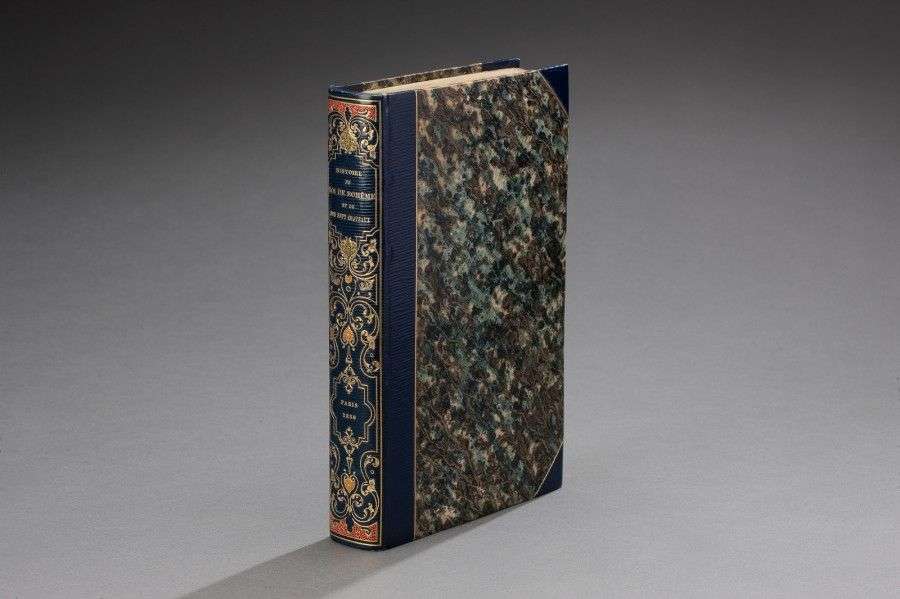 [LITTERATURE] - NODIER Charles. Histoire du Roi de Bohème et de ses sept châteaux. Paris, Delangle, 1830| in-8°, demi-maroquin bleu à long grain à coins, filet doré aux mors et coins, dos orné en long d'un grand décor "rocaille" mosaïqué de rouge en tête et pied et de vert et citron au centre, les parties mosaïquées criblées de petits points dorés (Maylander E. et A)| 398pp. Edition originale et premier tirage des 50 vignettes in texte de Tony Johannot gravées sur bois par Porée. Un des très rares exemplaires du tirage de luxe (24 exemplaires), celui-ci 1 des 12 sur papier de hollande. Exemplaire parfaitement établi dans une fine reliure de Maylander.