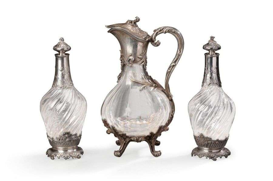 Aiguière en cristal, la monture en bronze argenté à décor de feuilles de c