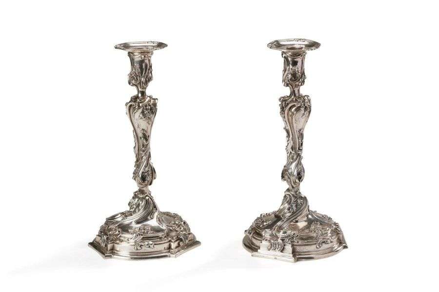 Paire de bougeoirs en argent, richement décorés d'acanthes, enroulements, cartouches, feuillage et fleurettes.