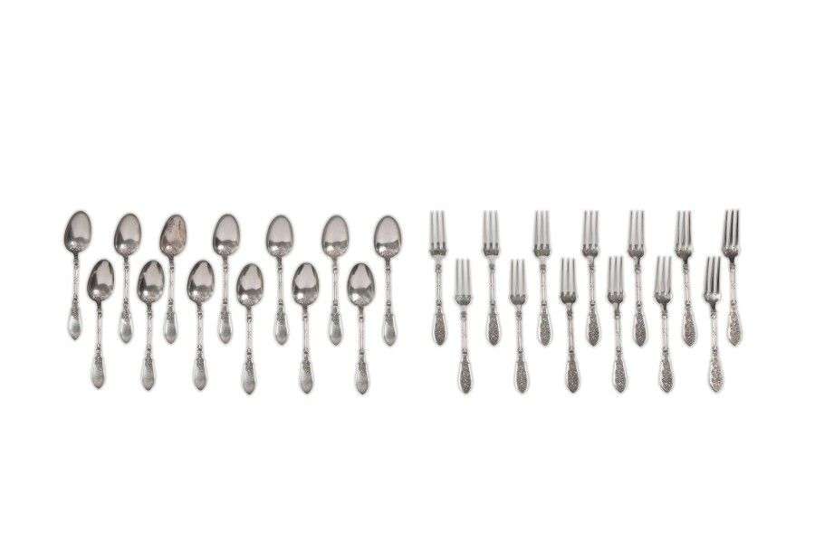 Treize couverts en argent modèle baguettes rubannées, manche amati réhaussé de fleurs et d'instruments de musique.