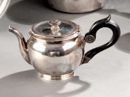 Théière égoïste en argent de forme ronde, posant sur pied bâte et anse en bois noirci amovible.