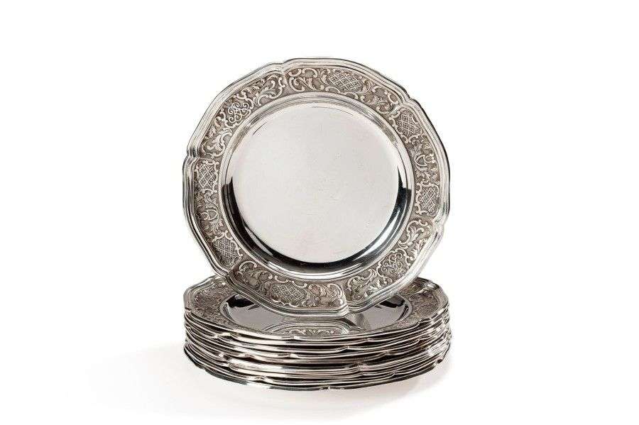 Suite de douze assiettes en argent, de forme circulaire, à filets contours.