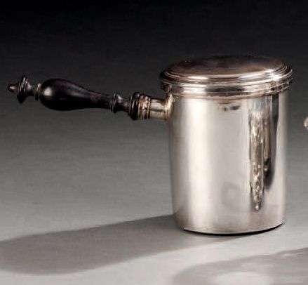 Petite laitière courverte en argent uni et un réchaud encastrable également en argent. Manche latérale en bois noirci.