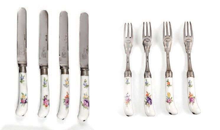 Ensemble de quatre couteaux et quatre fourchettes à manche en porcelaine et lames et fourchons en argent gravé d'armoiries.