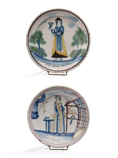 Deux plats circulaires en faience à décor polychrome de personnages costumés