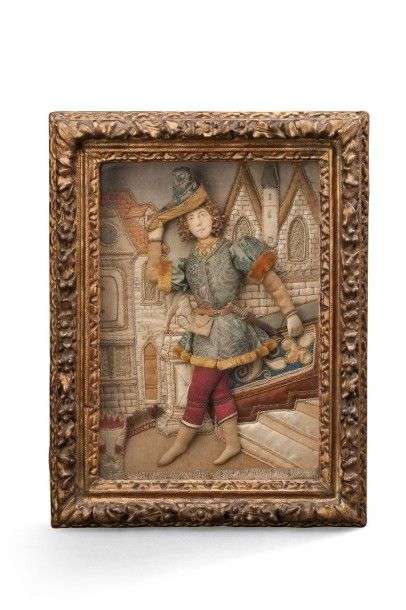 Curieux tableau en relief à décor d'un noble personnage richement vêtu descendant un escalier, des architectures en arrière-plan. Dans un cadre en bois sculpté et doré à décor de guirlandes de fleurs, fruits et feuilles d'eau. Fin du XVIIème ou début du XVIIIème siècles. H: 38 - L: 29 cm