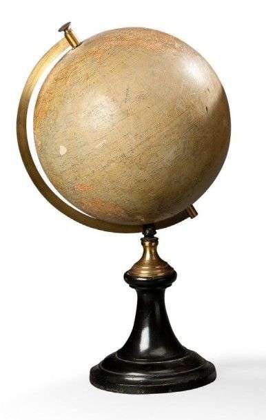 Globe terrestre| piédouche à monture en laiton Socle en bois noirci (usures).