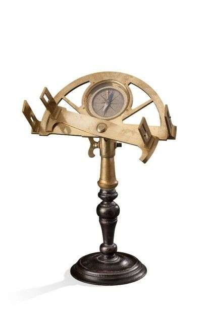 Graphomètre à pinnules en laiton posant sur un pied en bois tourné.