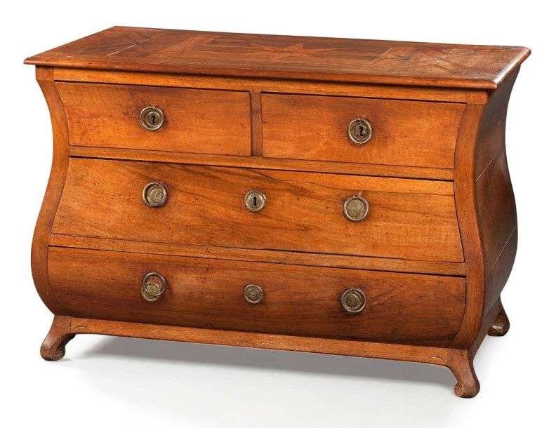 Commode en noyer, le plateau à décor d'intarsia d'une étoile en prunier et buis| de forme rectangulaire à façade sinueuse, elle ouvre par quatre tiroirs avec traverses. Travail provincial du milieu du XVIIIème siècle.Anneaux de tirage et macarons en métal repoussé. H: 87,5 - L: 130 - P: 73,5 cm