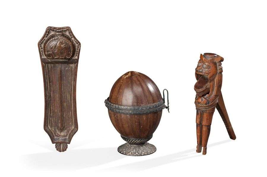 Lot comportant un casse-noisettes en poirier sculpté à décor d'un homme barbu tenant une sphère, une noix de coco à monture en métal à piédouche à feuillages et une monture de râpe à tabac à décor d'un équipage marquée «Lafon». Art populaire du XVIIIème siècle (éclats). H: 19,5 cm