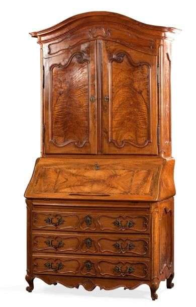 Meuble scriban en trois parties en noyer, ronce de noyer et larges filets en frisage| la partie haute ouvre par deux battants| la partie médiane formant scriban ouvre par un abattant découvrant un casier muni de neuf tiroirs et comporte un compartiment à secret muni de six tiroirs. La partie basse ouvre par trois larges tiroirs et repose sur des pieds cambrés à enroulements| la traverse basse chantournée à décor d'une coquille. Travail de l'Est de la France de la fin du XVIIIème siècle. H: 254 - L: 123 - P: 62 cm(*)