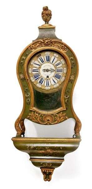 Cartel à poser et son cul-de-lampe en vernis à fond vert et décor de bouquets feuillagés. Le cadran à cartouches émaillés signé «Hentschel à Strasbourg» indique les heures en chiffres romains et les minutes en chiffres arabes par tranches de cinq.