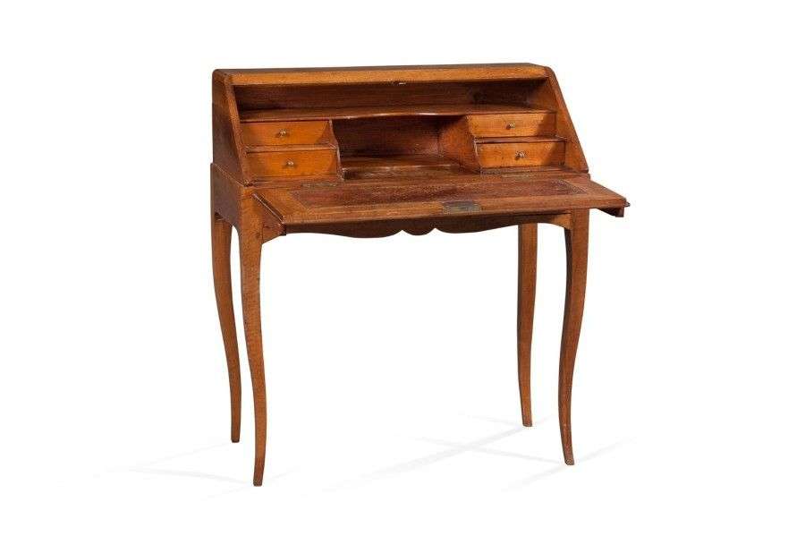 Bureau de pente en merisier, il ouvre par un abattant découvrant un secret, des casiers et quatre tiroirs. Deux petits tiroirs en ceinture.