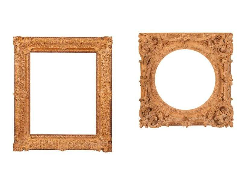 Deux cadres en chêne, buis ou noyer finement sculptés| l'un à motifs Régence de rinceaux feuillagés et écoinçons à rosaces| l'autre à motifs repercés rocailles à angles à coquilles.