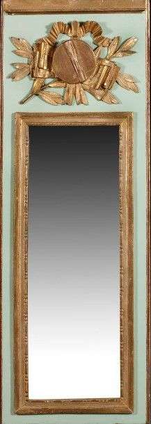 Trumeau en bois laqué vert céladon et doré| à décor d'une branche de laurier et noeud de ruban