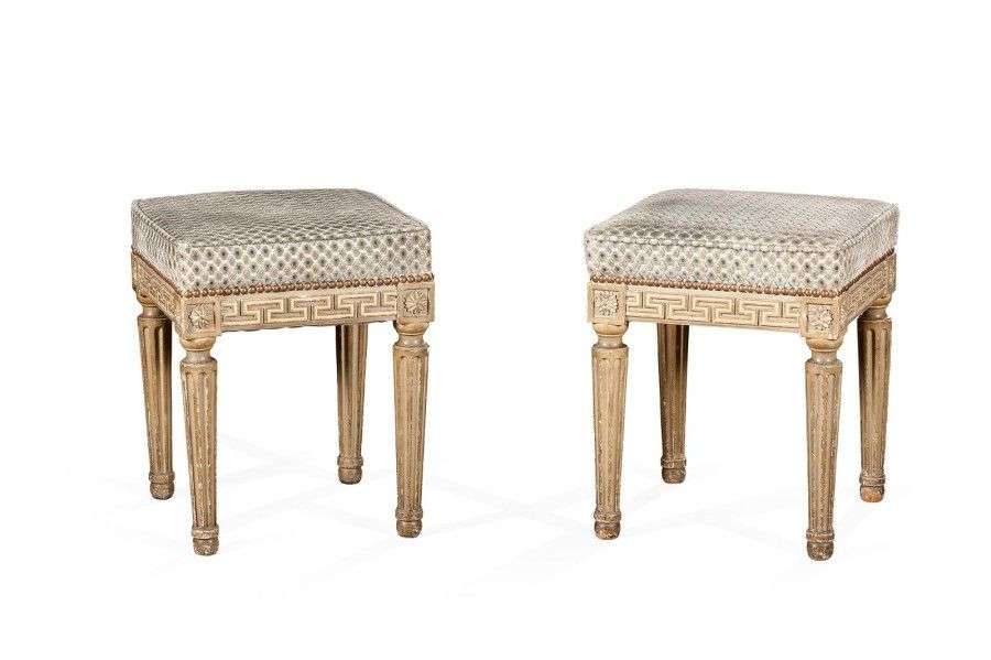 Paire de tabourets en hêtre mouluré et sculpté| les ceintures à décor de grecques| dés à rosaces| pieds fuselés à cannelures.