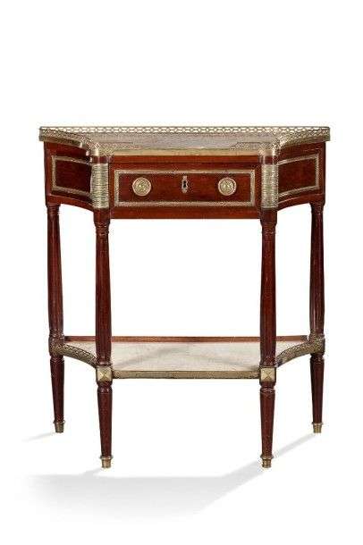 Console en acajou et placage d'acajou moucheté| de forme trapézoïdale à côtés incurvés, elle ouvre par un tiroir en ceinture et repose sur des pieds fuselés à bagues réunis par une tablette. Ornementation de bronze ciselé ou moleté tels que galerie ajourée, anneaux, rosaces et grattoirs. Epoque Louis XVI. Plateau de marbre blanc veiné gris encastré. H: 85 - L: 78 - P: 36 cm