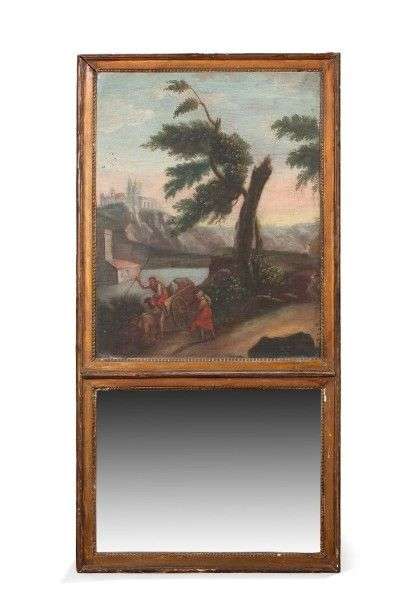 Trumeau en bois mouluré et rangs de perles dorés| la peinture marouflée sur contreplaqué représente un paysage animé de paysans et d'architectures| la partie basse foncée d'un miroir au mercure.