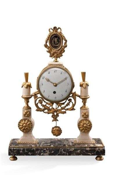 Petite pendule dite «portique» en bronze ciselé, doré, marbres et verre églomisé| l'amortissement à décor d'un médaillon représentant un faune sonnant dans un cadre à rubans et attributs de l'Amour| le mouvement encadré de deux pilastres à rosaces| base quadrangulaire à rangs de perles| pieds pastilles| le cadran émaillé indique les heures en chiffres arabes. Fin du XVIIIème siècle (suspension transformée). H: 37 - L: 27 - P: 9 cm