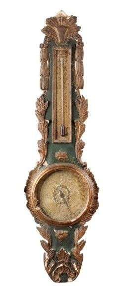 Baromètre-thermomètre en bois chantourné, sculpté, doré et rechampi vert|