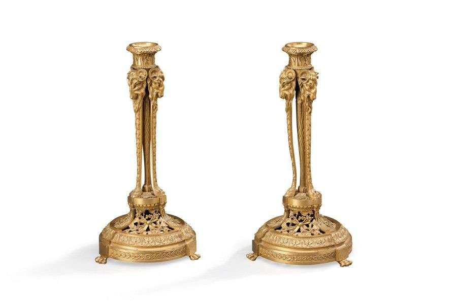 Paire de bougeoirs en bronze ciselé et doré| les bobèches reposant sur des