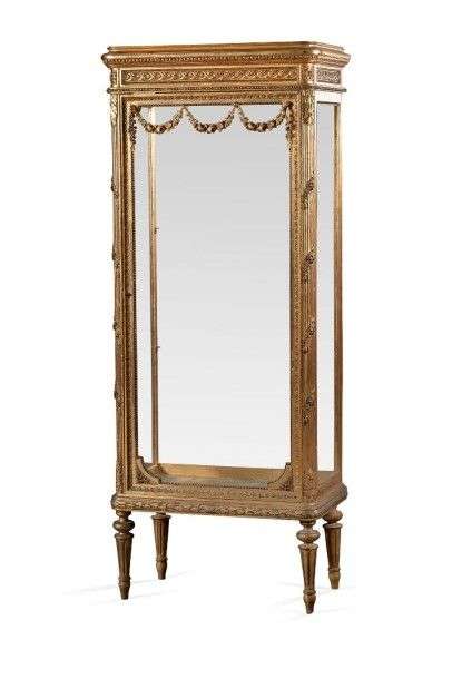 Vitrine en bois mouluré, sculpté et doré à décors d'oves et rangs de perles.
