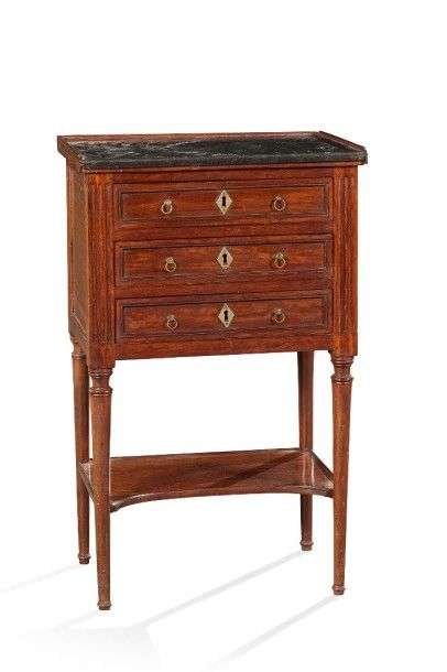 Table dite «chiffonnière» en acajou| de forme rectangulaire, elle ouvre par trois tiroirs avec traverses| montants plats à cannelures| pieds fuselés à bagues réunis par une tablette échancrée. Travail de port de la fin du XVIIIème siècle. Plateau de marbre noir encastré (accidenté). H: 74 - L: 46 - P: 32,5 cm