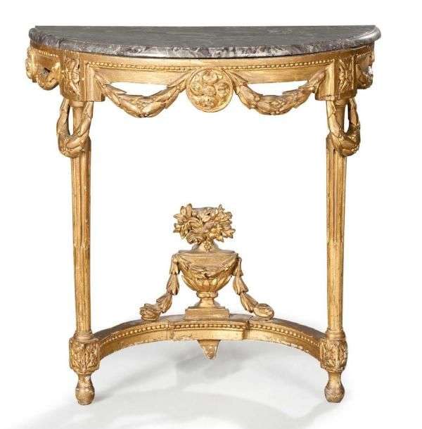 Console demi-lune en bois sculpté et doré| la ceinture à décor de rosace, guirlandes de feuilles et graines de laurier et rangs de perles| dés à rosaces| pieds fuselés à cannelures rudentées réunis par une entretoise ornée d'un vase fleuri et feuillagé. Fin du XVIIIème siècle (piqûres, renforts, reprise à la dorure et un manque à l'arrière du vase). Plateau de marbre gris Sainte-Anne (restauré). H: 76 - L: 73 - P: 35,5 cm(*)