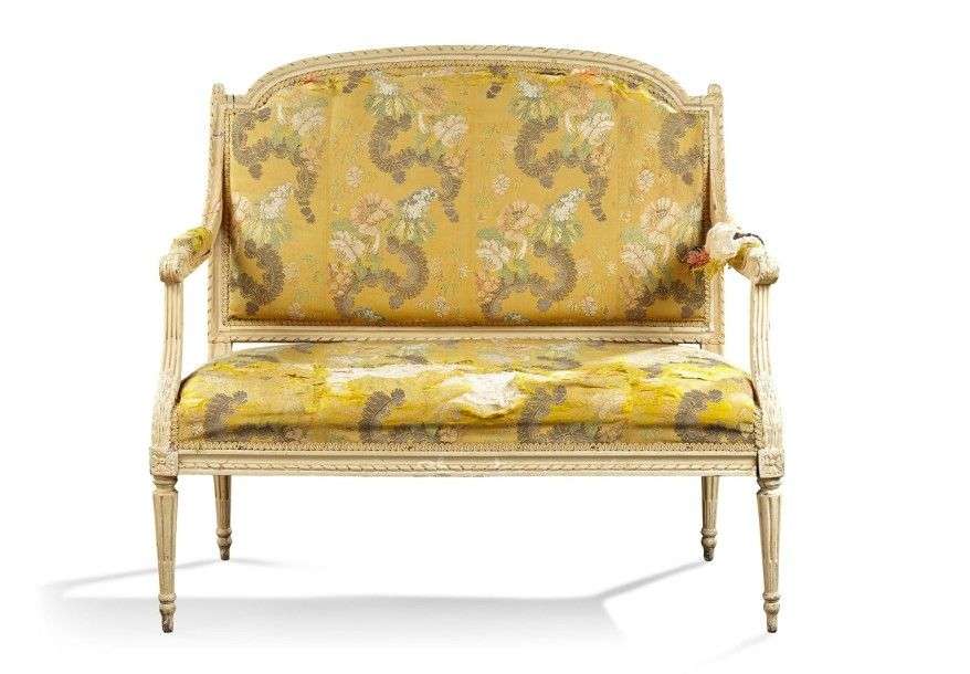 Petit canapé en bois laqué crème, mouluré et sculpté.
