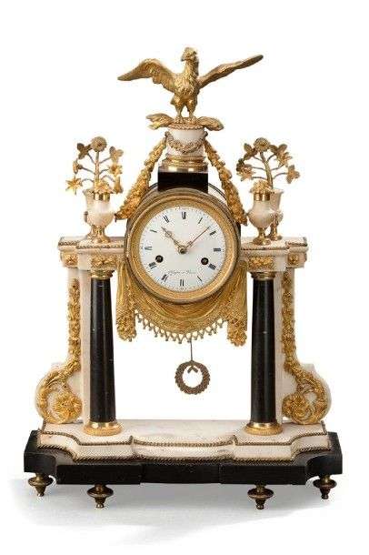 Pendule dite «portique» en marbres blanc et noir et bronze ciselé et doré| elle est surmontée d'un aigle aux ailes déployées tenant des foudres| sur l'entablement, des vases à bouquets fleuris et feuillagés| les montants chantournés en consoles ou colonnes| base moulurée à rangs de perles ou cordelette torsadée| contre-socle de marbre noir à angles évidés| petits pieds toupies. Le cadran, signé «Chopin à Paris», indique les heures en chiffres romains et les minutes en chiffres arabes par tranches de quinze (rapporté). Fin du XVIIIème siècle (égrenures au marbre). H: 51 - L: 36 - P: 14,5 cm
