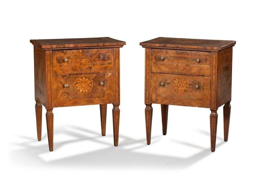 Paire de petites commodes en placage de noyer à décor de filets et rosaces. Elles ouvrent par deux tiroirs, pieds gaine.