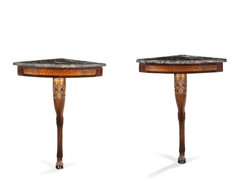 Paire de consoles d'angle en bois sculpté, doré et laqué| la ceinture marquetée de frises de rubans et enroulements à feuilles| le pied central à décor de lambrequins, palmettes et rinceaux se terminant en jarret de cervidé.