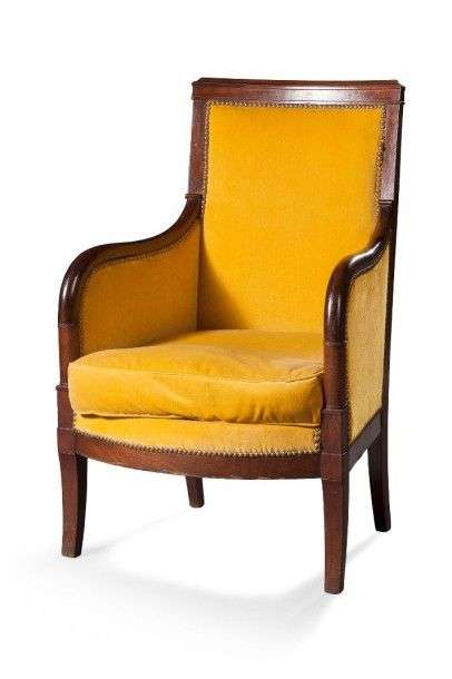Bergère à dossier légèrement incurvé en acajou et placage d'acajou| accoto
