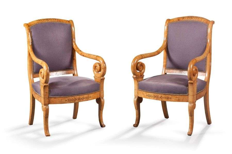 Paire de fauteuils en frêne et placage de frêne à décor marqueté de rosaces et palmettes en amarante| accotoirs à enroulements| pieds en jarrets à l'avant et sabres à l'arrière.