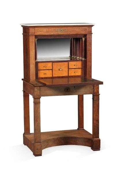 Bonheur du jour en placage de noyer, la partie haute ouvrant par un abattant gainé de cuir découvrant un petit théâtre flanqué de colonnettes et cinq petits tiroirs plaqués de citronniers| et un large tiroir. La partie basse ouvre par un large tiroir et repose sur des pieds droits réunis par une entretoise concave. Plateau de marbre blanc veiné gris. Epoque Empire H: 132 L: 71 P: 51 cm